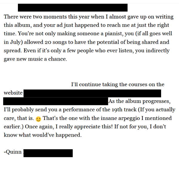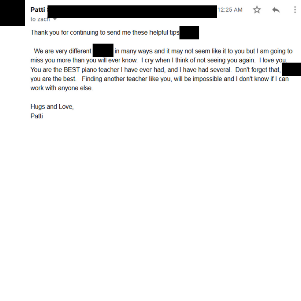 "You are the best piano teacher... Finding another teacher like you will be impossible and I don't know if i can work with anyone else"