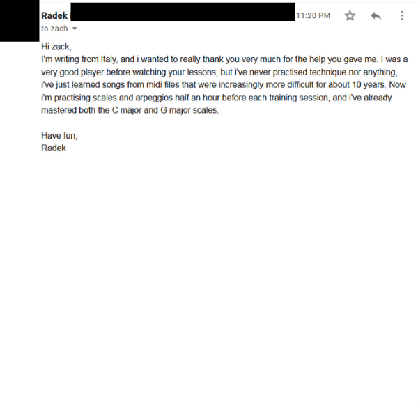 "Thank you very much for the help you gave me... Now I'm practicing scales and arpeggios half an hour before each training session"
