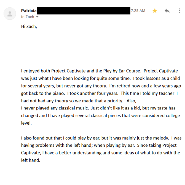 "I enjoyed both Project Captivate and the Play by ear course... Since taking Project Captivate, I have a better understanding of what to do with the left hand"