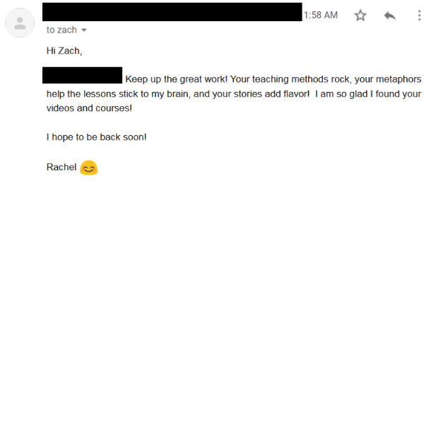 "Your teaching method rock, your metaphors help the lessons stick to my brain and your stories add flavor! I am so glad I found your videos and courses"