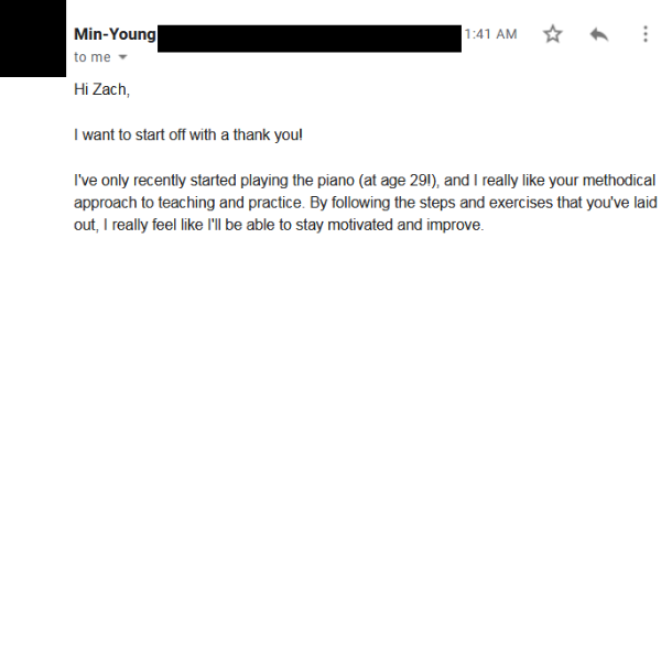 "I have to say this is the most efficient piano practice that I have ever had. A big big thank YOU for organizing and sharing these secrets"