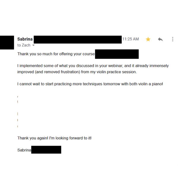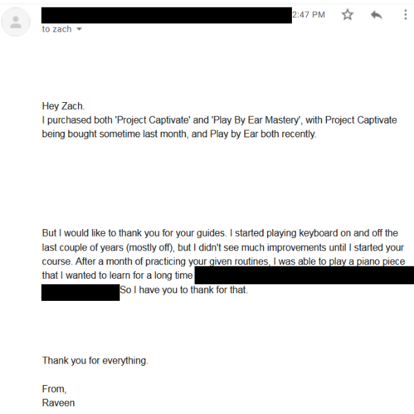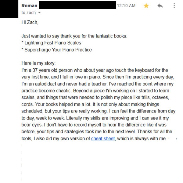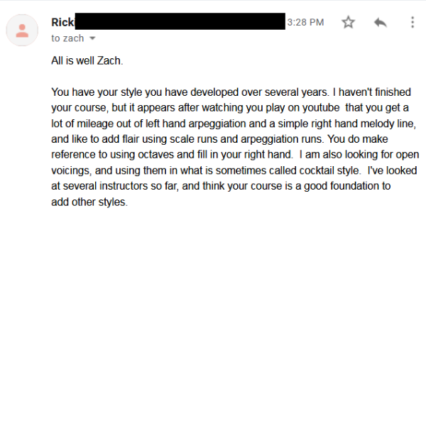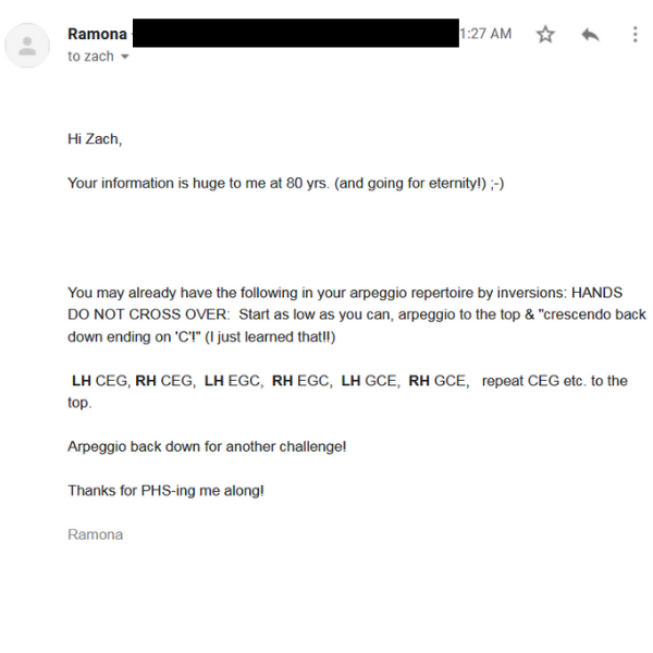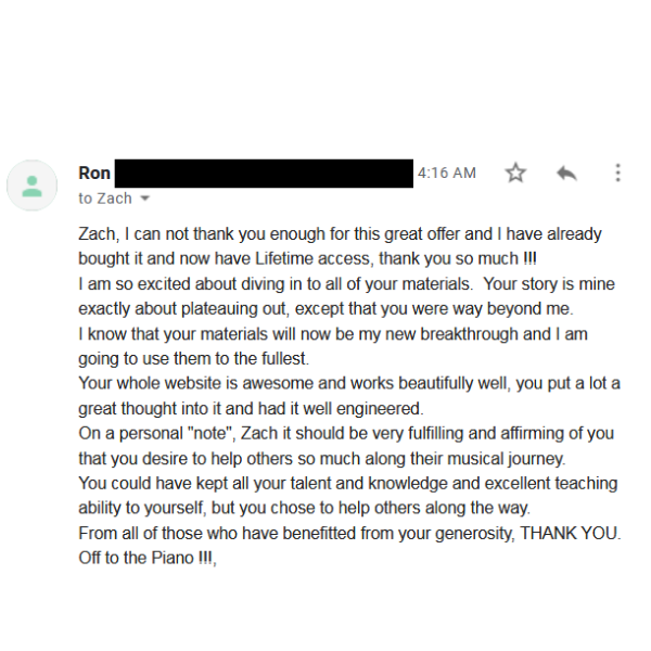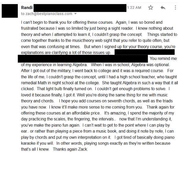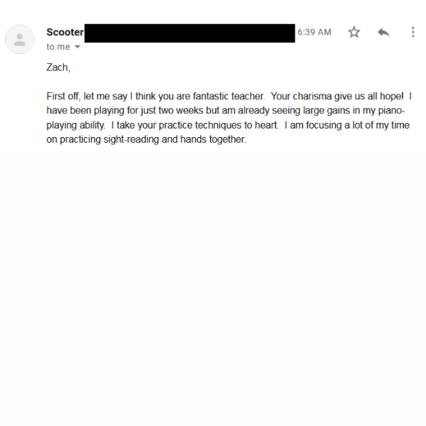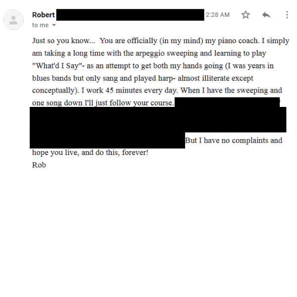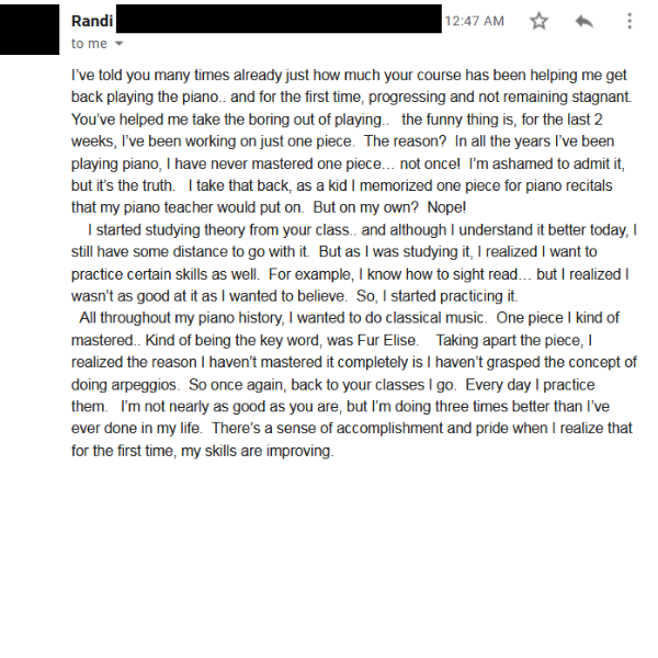 "You are officially (in my mind) my piano coach. I work 45 minutes everyday. When I have sweeping and one song down I'll just follow your course"