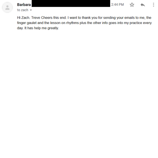 "The finger gauntlet and the lesson on rhythms plus the other info goes into my practice everyday. It has helped me greatly"