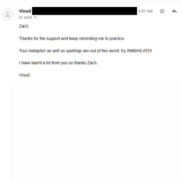 "Thanks for the support and keep reminding me to practice. Your metaphors as well as spellings are out of this world. I have learnt a lot from you"