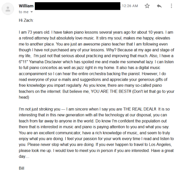 "You are just an awesome piano teacher ... there are many so-called piano teachers on the internet. But believe me, YOU AR THE BEST! ... excellent communicator, have a rich knowledge of music"