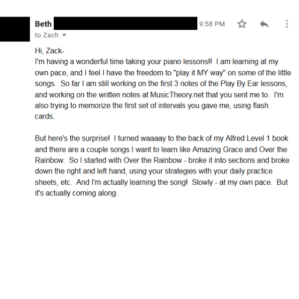 "I'm having a wonderful time taking your piano lessons! I am learning at my own pace"