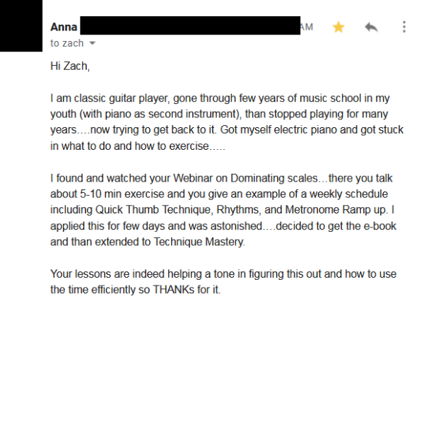 "I am hooked on your approach... Plus I enjoyed... Plus I have learned so much... I have learned my scales fool-proof. All of them with correct fingering "