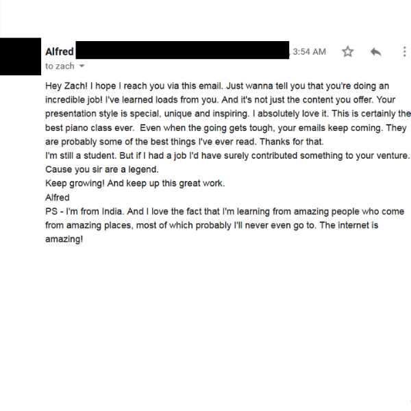 "I've learned loads from you. And it's not just the content you offer. Your presentation style is special, unique and inspiring. I absolutely love it. This is certainly the best piano class ever."