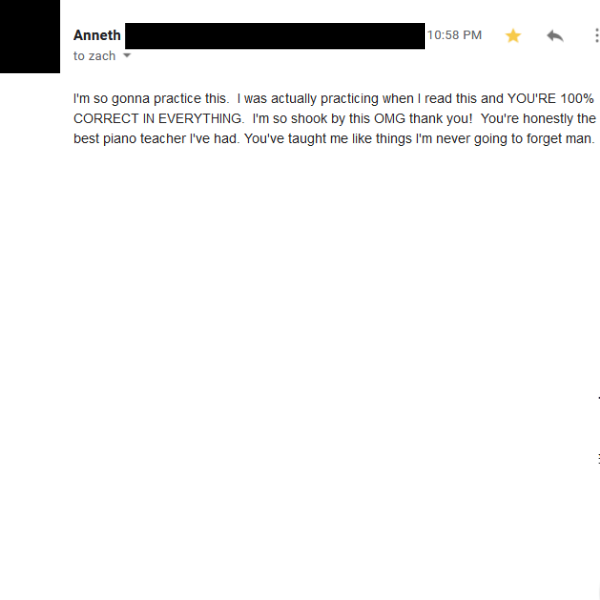 "YOU'RE 100% CORRECT IN EVERYTHING.You're honestly the best piano teacher I've had. You've taught me like things I'm never going to forget man"