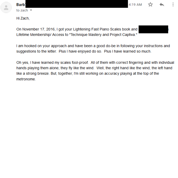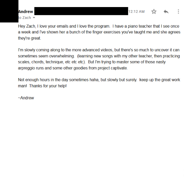 "I love the program. I have a piano teacher... and I've shown her a bunch of the finger exercises you've taught me and she agrees they're great"