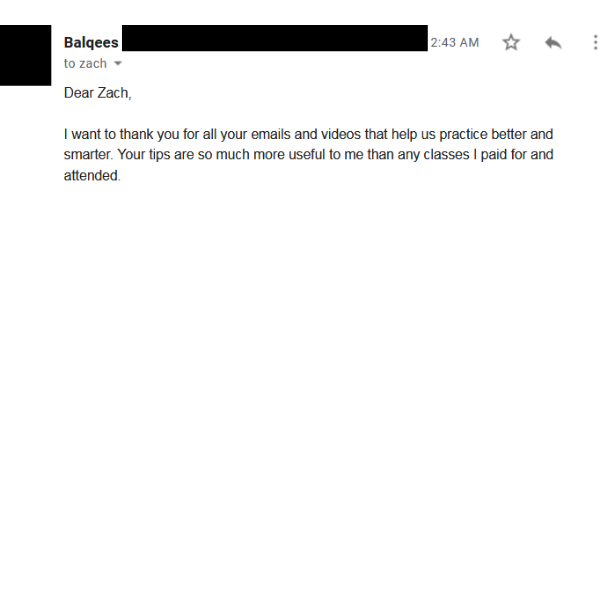 "I want to thank you for all your emails and videos that help us practice better and smarter. Your tips are so much more useful to me than any classes I paid for and attended"