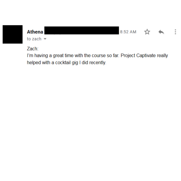 "I'm having a great time with the course so far. Project Captivate really helped with a cocktail gig I did recently"