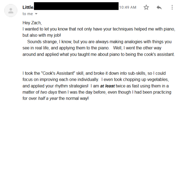 "Your techniques helped me with piano... You are always making analogies with things you see in real life, and applying them to the piano"