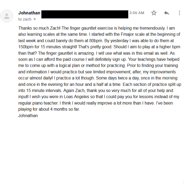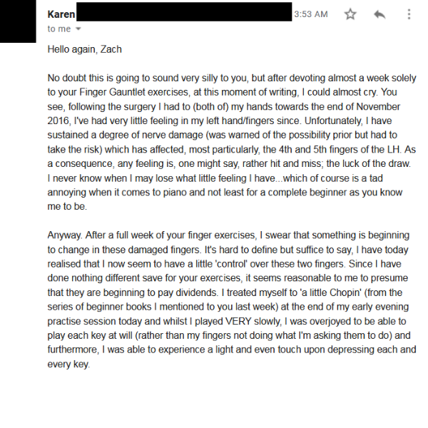 "Thanks so much Zach! the finger gauntlet exercise is helping me tremendously... I think i would really improve a lot more than I have"