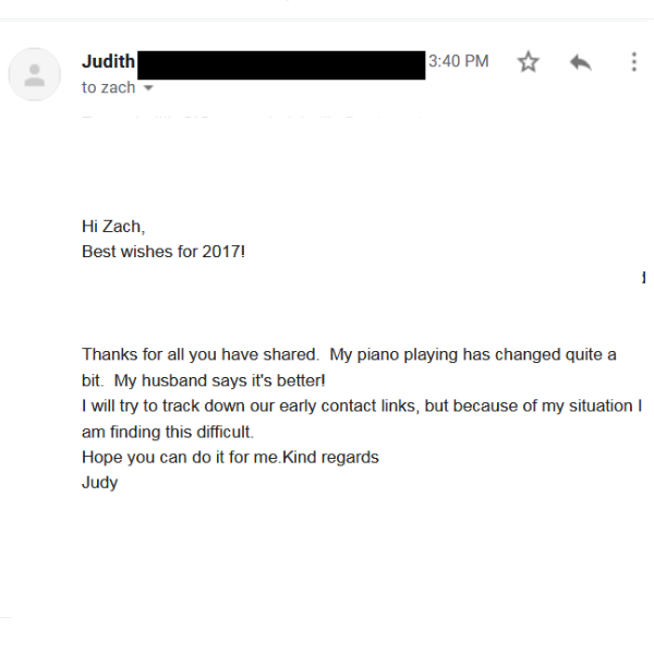 "Thanks for all you have shared. My piano playing has changed quite a bit. My husband says it's better!"